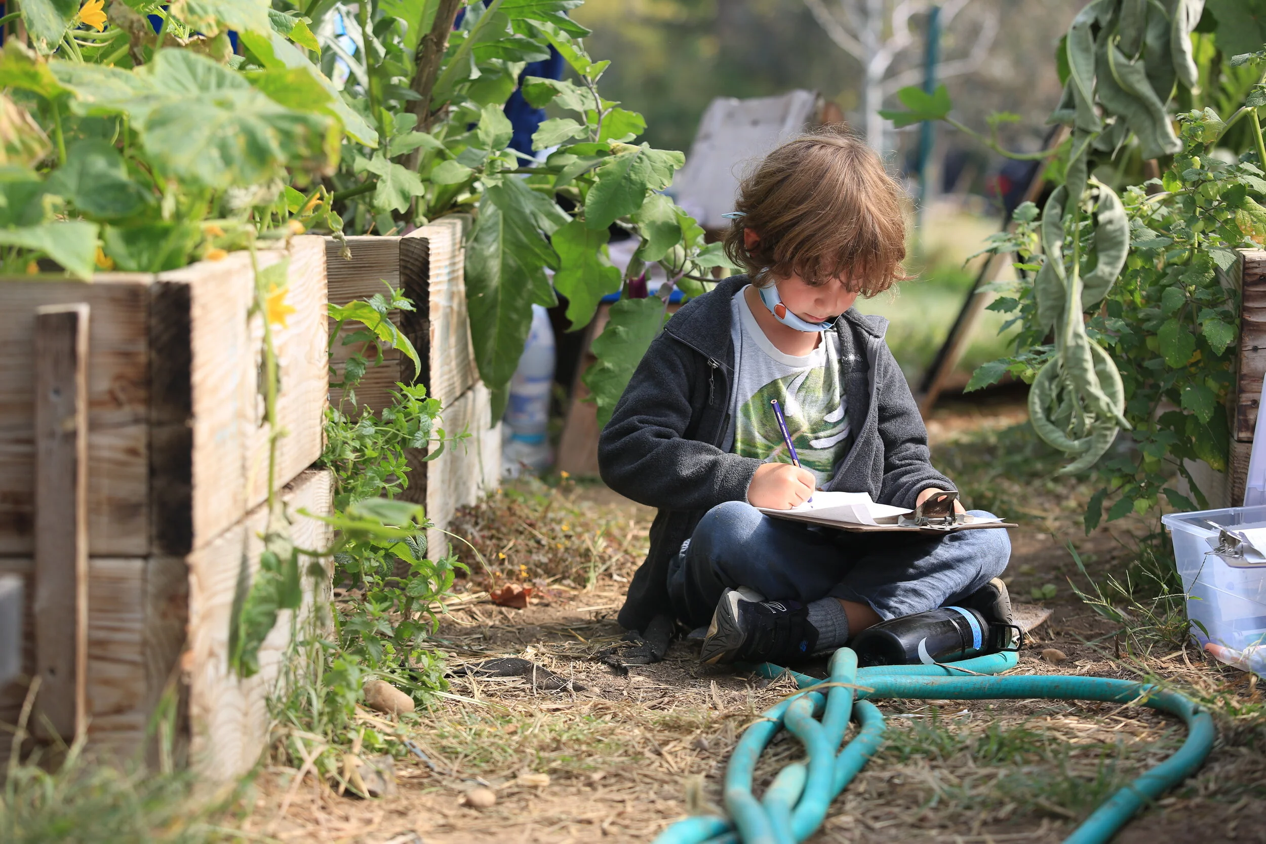 The nice weather has been holding up which has allowed us to spend time outdoors. Recently, we spent two days in the lower greenhouse doing observations. We first practiced observing a praying mantis that a student brought into class. Questioned we asked: What color is it? How big is it? What is it’s texture like? Is it alive?Then each student was asked to take a clipboard, a carpet square if they liked, and their individual box of pencils and markers. They each found a cozy spot to focus on one thing to draw and write about. Students observed eggplants, husk cherries, crickets, the exterior of the greenhouse, and more.